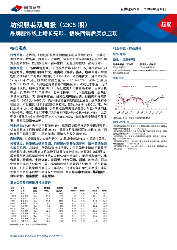 【国信证券】【20230312】20230312-国信证券-纺织服装双周报(2305期):品牌服饰线上增长亮眼,板块回调后买点显现-13页