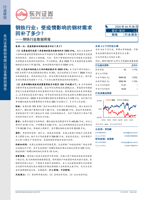 【东兴证券】【20200608】20200608-东兴证券-钢铁行业数据周报:受疫情影响的钢材需求回补了多少?-18页