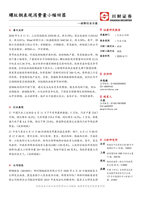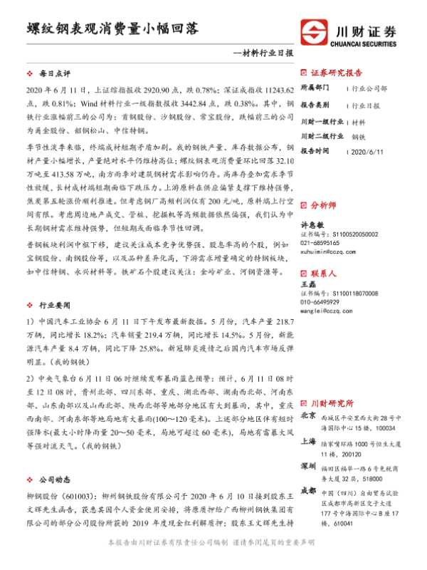 【川财证券】【20200611】材料行业日报:螺纹钢表观消费量小幅回落-3页