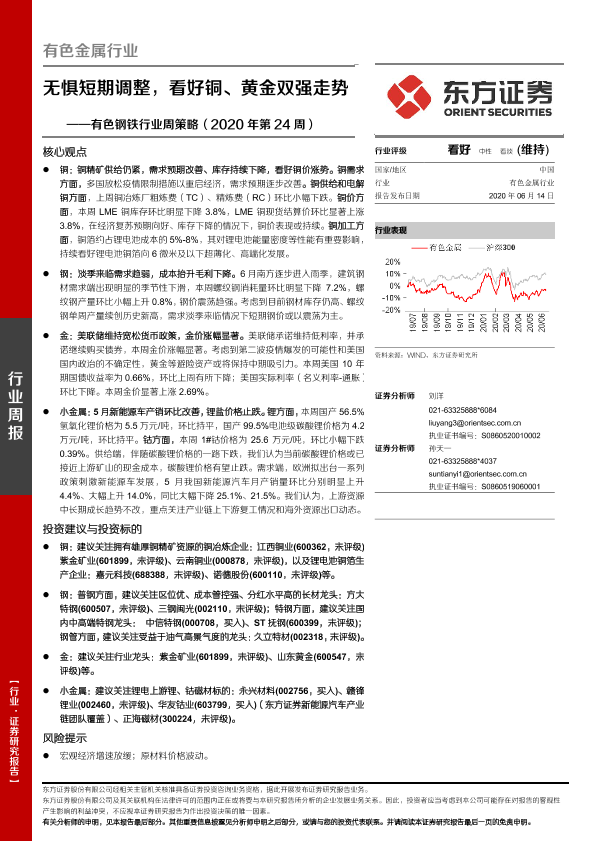 【东方证券】【20200614】有色钢铁行业周策略(2020年第24周):无惧短期调整,看好铜、黄金双强走势-25页