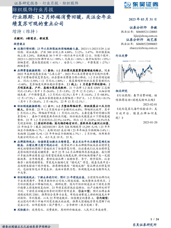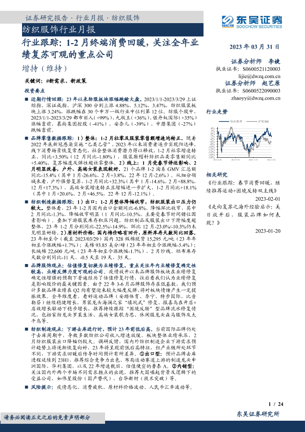 【东吴证券】【20230331】20230331-东吴证券-纺织服饰行业月报:行业跟踪:1-2月终端消费回暖,关注全年业绩复苏可观的重点公司-24页