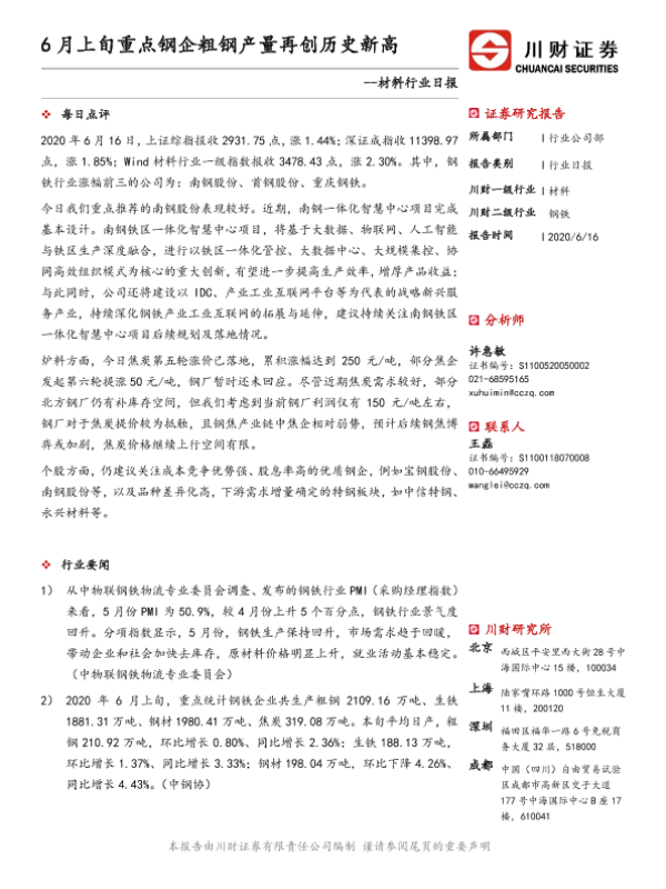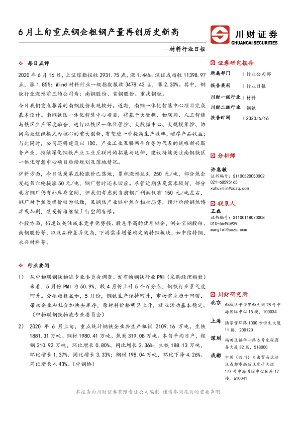 【川财证券】【20200616】6月上旬重点钢企粗钢产量再创历史新高-3页