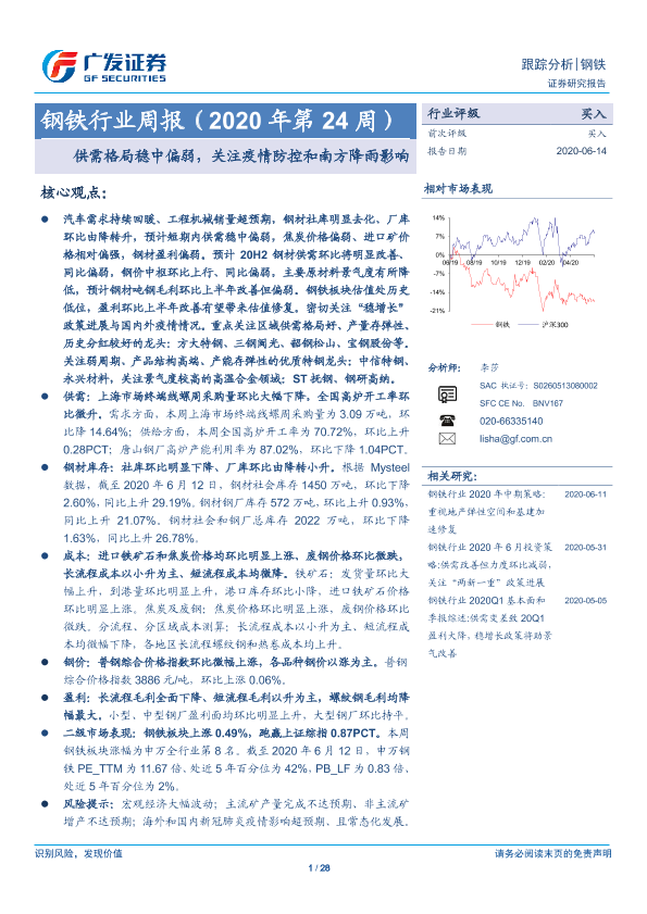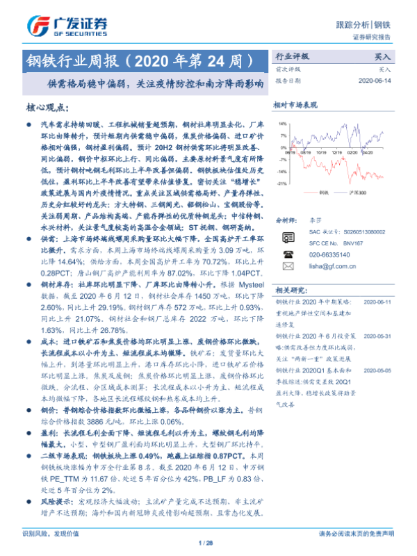 【广发证券】【20200614】20200614-广发证券-钢铁行业周报(2020年第24周):供需格局稳中偏弱,关注疫情防控和南方降雨影响-28页