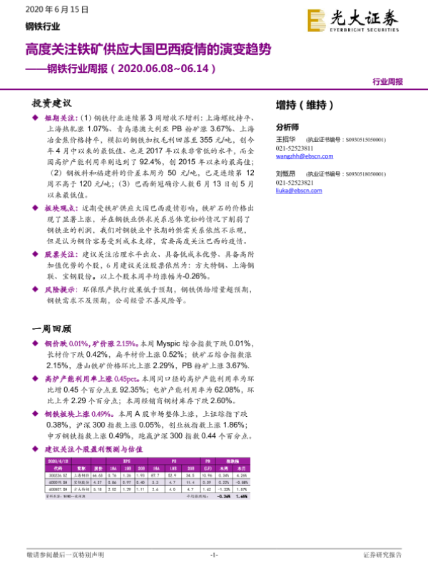 【光大证券】【20200615】20200615-光大证券-钢铁行业周报:高度关注铁矿供应大国巴西疫情的演变趋势-9页
