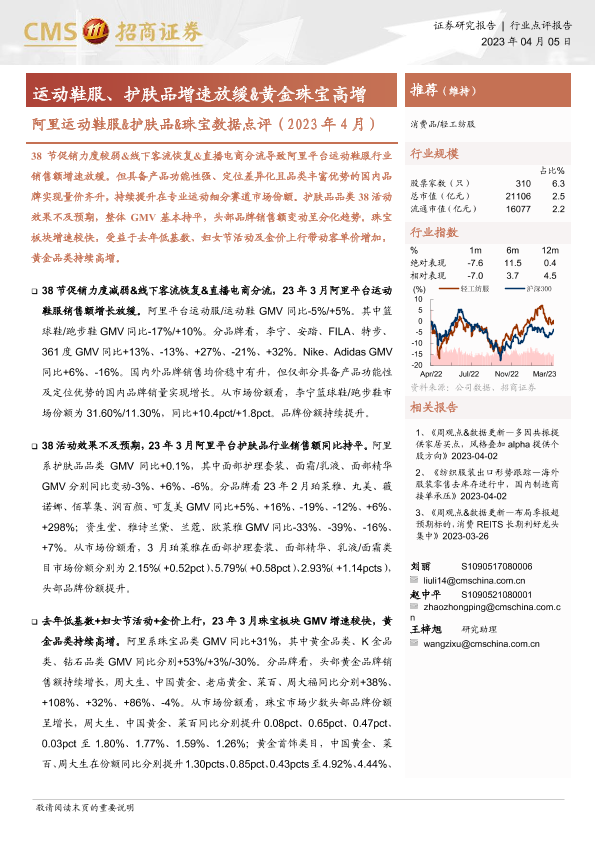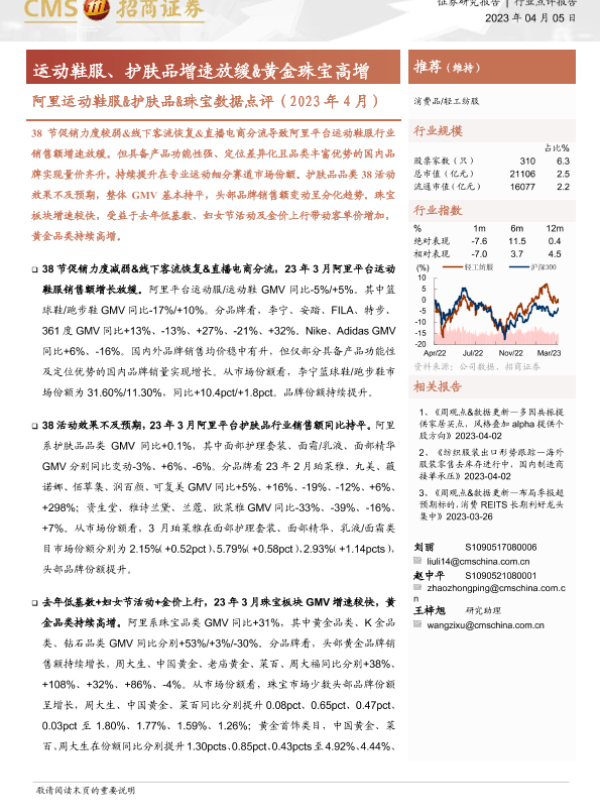【海通证券】【20230405】阿里运动鞋服&护肤品&珠宝数据点评(2023年4月):运动鞋服、护肤品增速放缓&黄金珠宝高增-14页