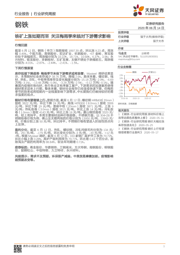 【天风证券】【20200614】20200614-天风证券-钢铁行业研究周报:铁矿上涨如期而至 关注梅雨季来临对下游需求影响-13页