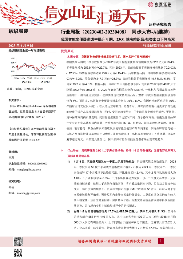 【山西证券】【20230409】纺织服装行业周报:我国智能坐便器渗透率提升可期,23Q1越南纺织品/鞋类出口下降高双-27页