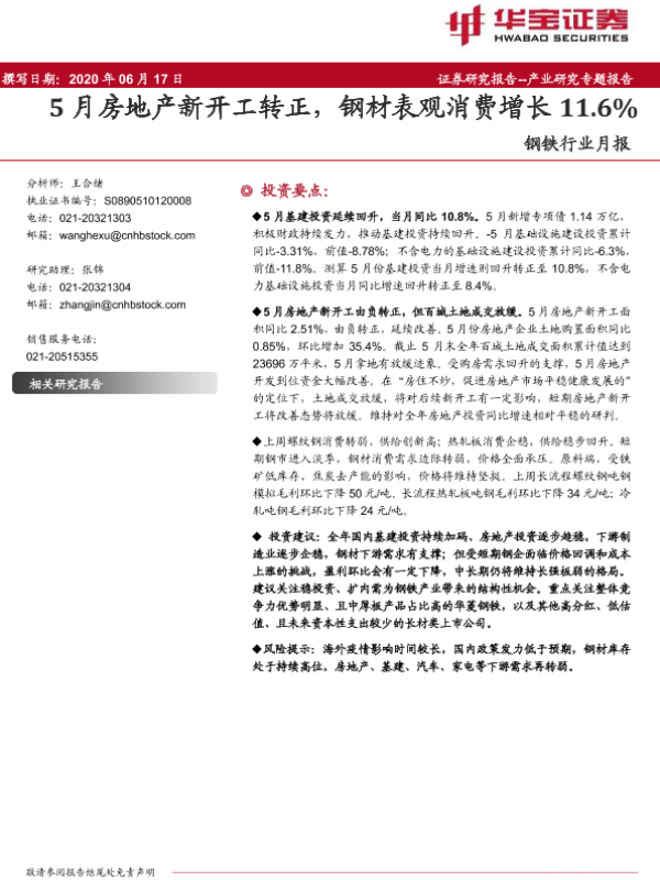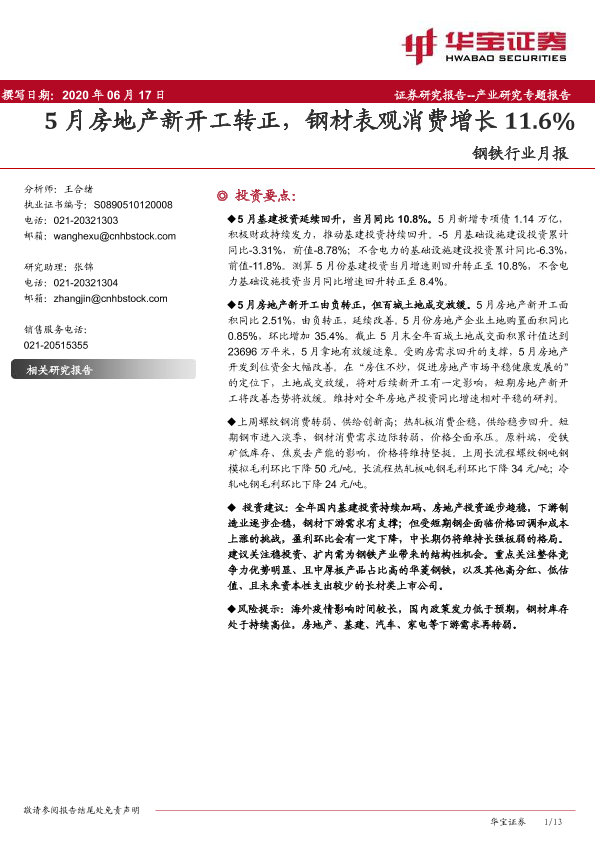 【华宝证券】【20200617】20200617-华宝证券-钢铁行业月报:5月房地产新开工转正,钢材表观消费增长11.6%-13页