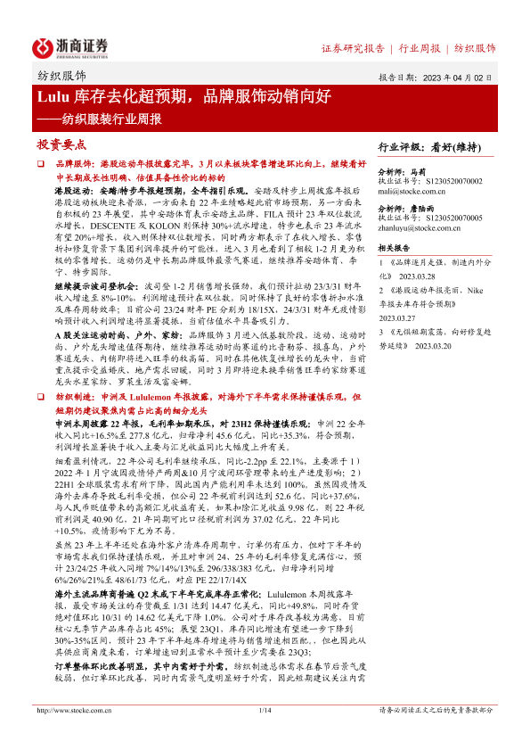【浙商证券】【20230402】20230402-浙商证券-纺织服装行业周报:Lulu库存去化超预期,品牌服饰动销向好-14页
