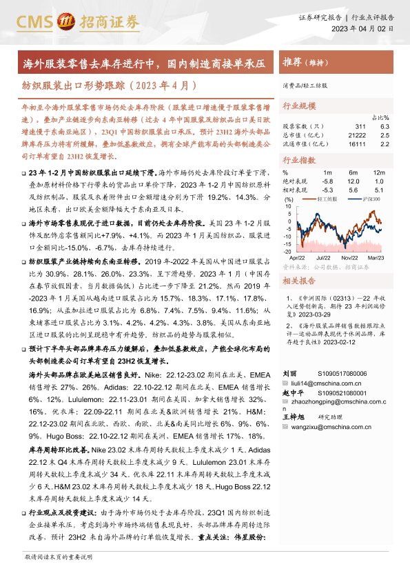 【海通证券】【20230402】纺织服装出口形势跟踪(2023年4月):海外服装零售去库存进行中,国内制造商接单承压-15页