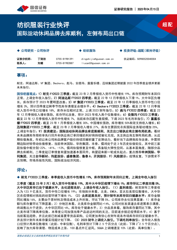 【国信证券】【20230415】纺织服装行业快评:国际运动休闲品牌去库顺利,左侧布局出口链-15页