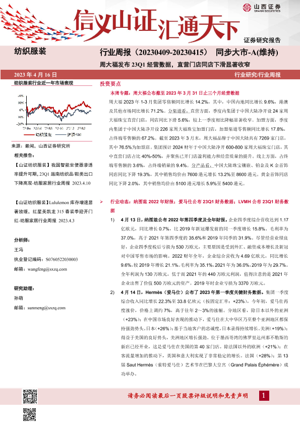 【山西证券】【20230416】20230416-山西证券-纺织服装行业周报:周大福发布23Q1经营数据,直营门店同店下滑显著收窄-23页