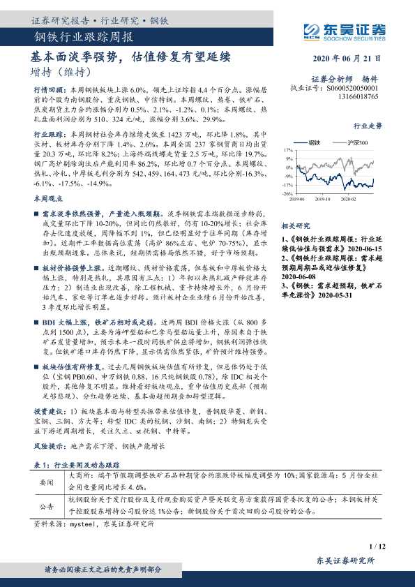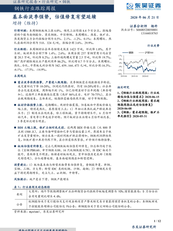 【东吴证券】【20200621】20200621-东吴证券-钢铁行业跟踪周报:基本面淡季强势,估值修复有望延续-12页