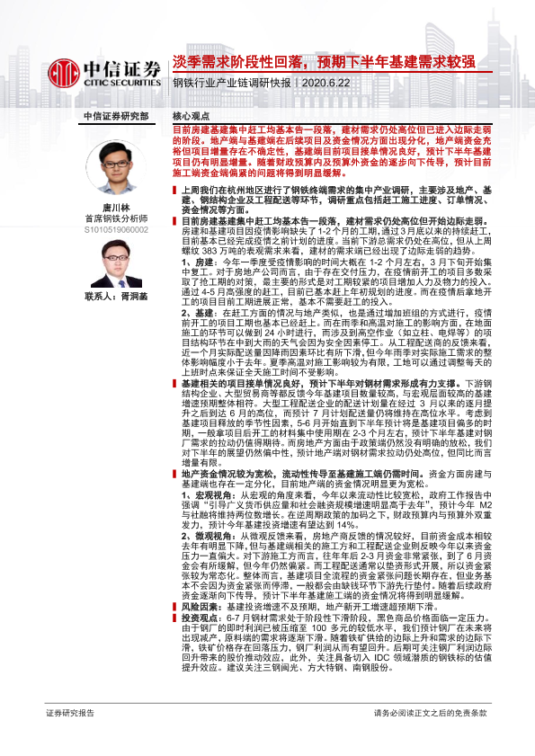 【中信证券】【20200622】20200622-中信证券-钢铁行业产业链调研快报:淡季需求阶段性回落,预期下半年基建需求较强-2页