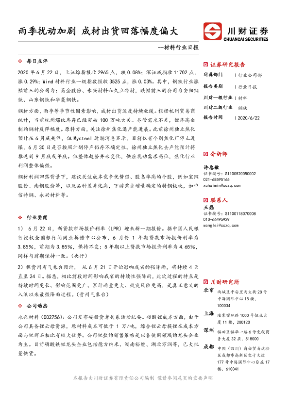 【川财证券】【20200622】材料行业日报:雨季扰动加剧 成材出货回落幅度偏大-3页