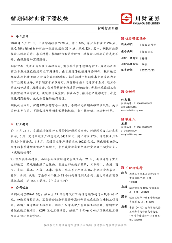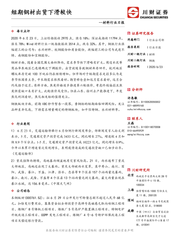 【川财证券】【20200623】材料行业日报:短期钢材出货下滑较快-3页