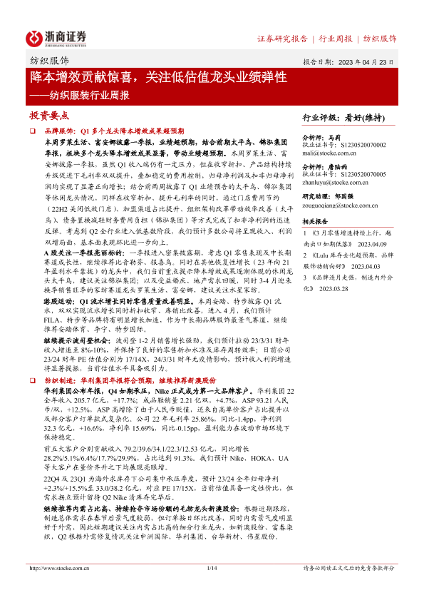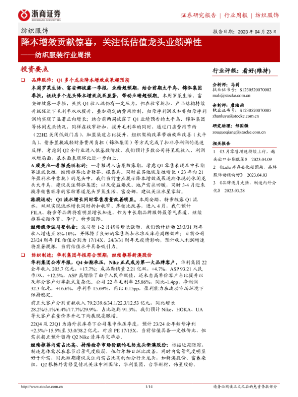 【浙商证券】【20230423】20230423-浙商证券-纺织服装行业周报:降本增效贡献惊喜,关注低估值龙头业绩弹性-14页
