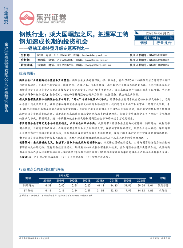 【东兴证券】【20200623】钢铁工业转型升级专题系列之一:乘大国崛起之风,把握军工特钢加速成长期的投资机会-19页