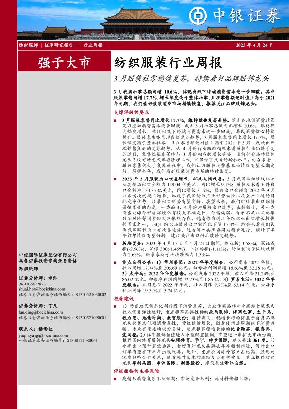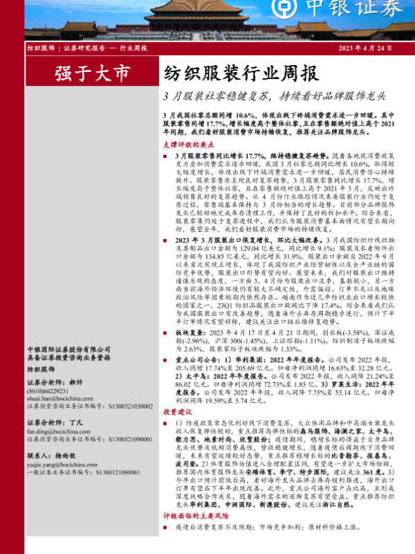 【中银证券】【20230424】20230424-中银证券-纺织服装行业周报:3月服装社零稳健复苏,持续看好品牌服饰龙头-19页