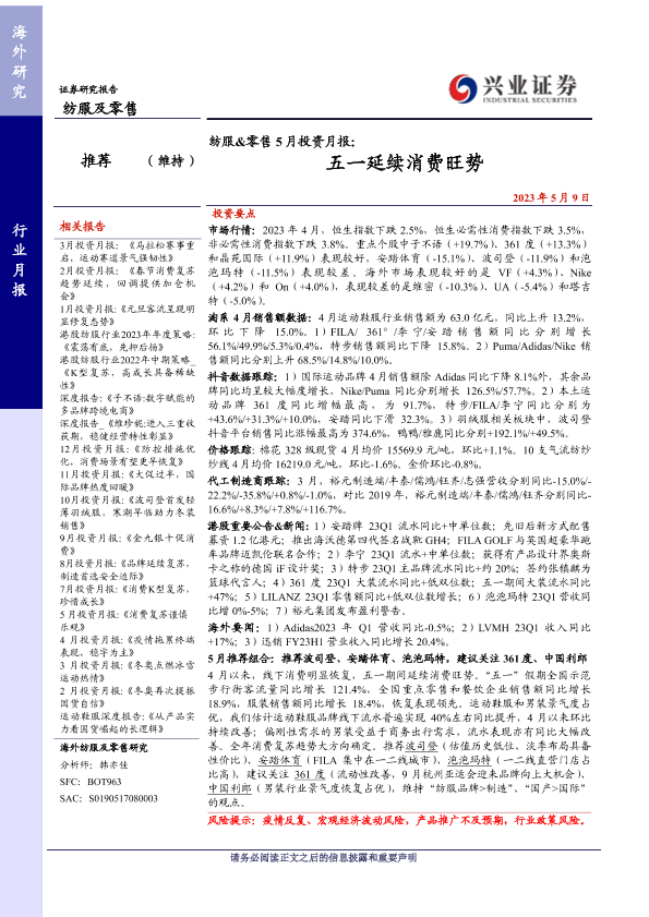 【兴业证券】【20230509】纺服&零售 5月投资月报:五一延续消费旺势-22页
