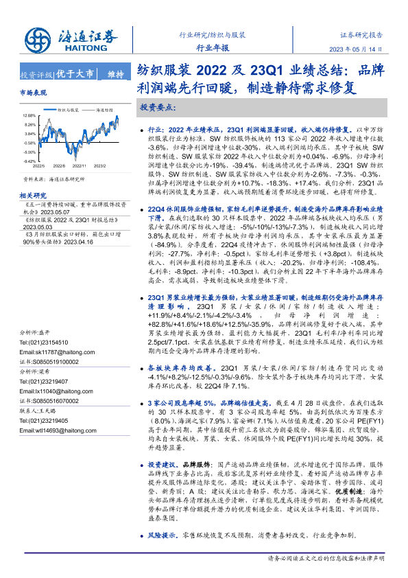 【海通证券】【20230514】纺织服装2022及23Q1业绩总结:品牌利润端先行回暖,制造静待需求修复-17页