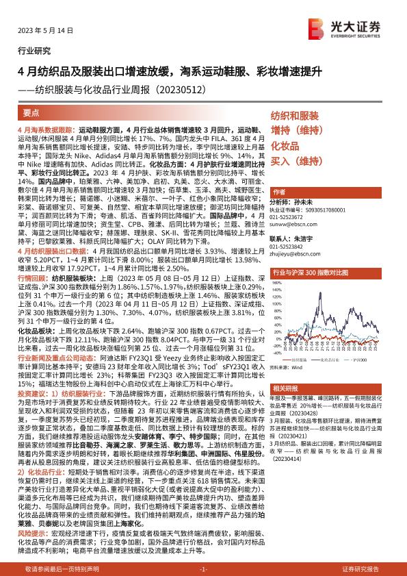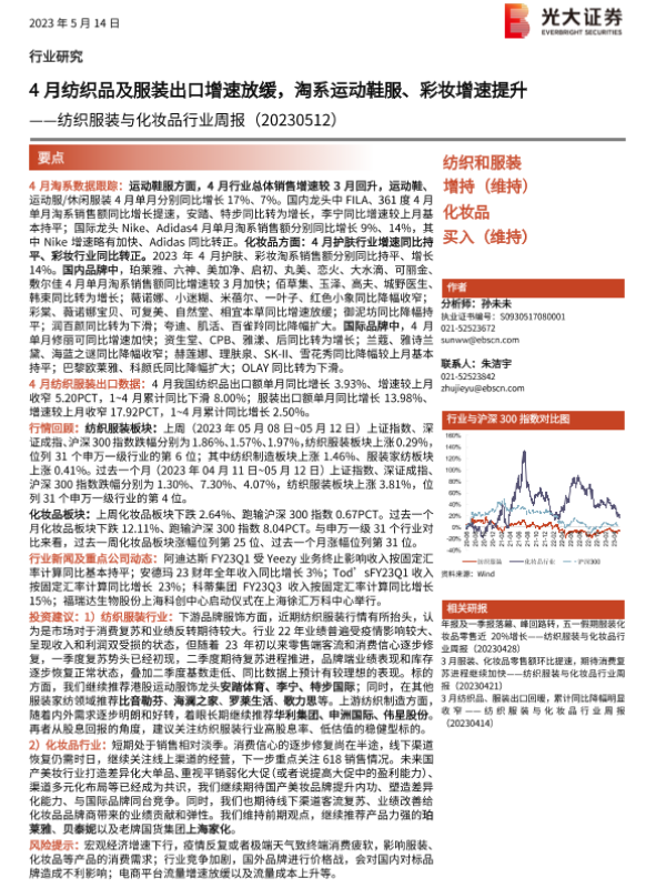 【光大证券】【20230514】20230514-光大证券-纺织服装与化妆品行业周报:4月纺织品及服装出口增速放缓,淘系运动鞋服、彩妆增速提升-13页