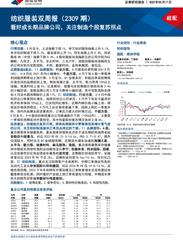 【国信证券】【20230517】20230517-国信证券-纺织服装双周报(2309期):看好成长期品牌公司,关注制造个股复苏拐点-13页