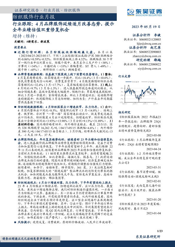 【东吴证券】【20230519】20230519-东吴证券-纺织服饰行业月报:4月品牌服饰延续逐月改善态势,提示全年业绩估值双重修复机会-23页