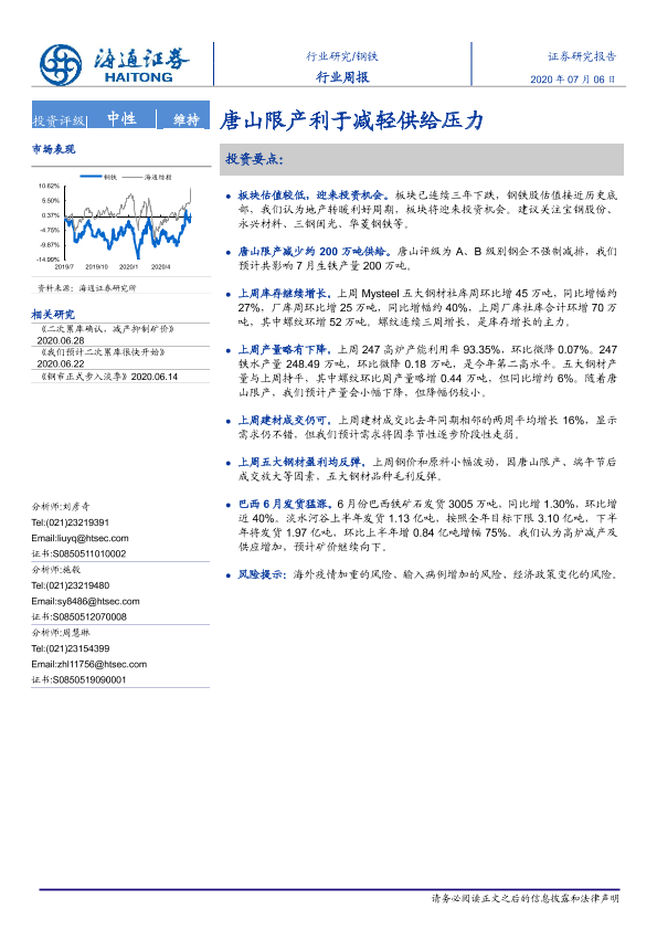 【海通证券】【20200706】20200706-海通证券-钢铁行业周报:唐山限产利于减轻供给压力-13页