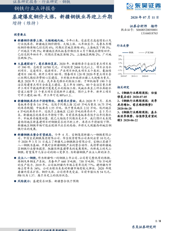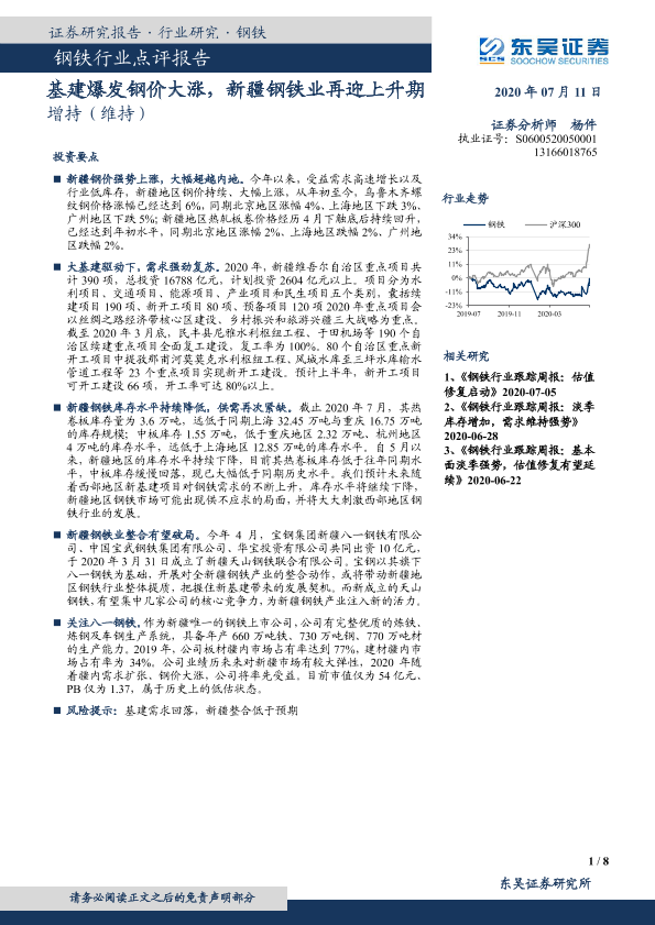 【东吴证券】【20200711】20200711-东吴证券-钢铁行业点评报告:基建爆发钢价大涨,新疆钢铁业再迎上升期-8页