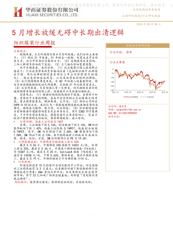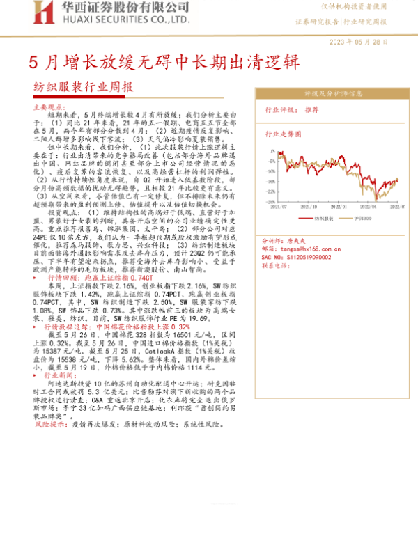 市场分析 投资观点 纺织服装 行业周报 风险提示