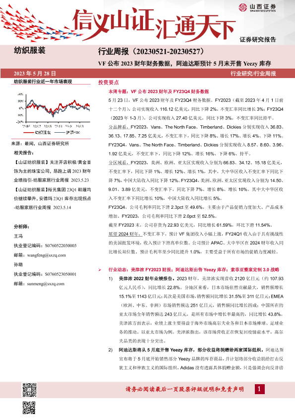 【山西证券】【20230528】20230528-山西证券-纺织服装行业周报:VF公布2023财年财务数据,阿迪达斯预计5月末开售Yeezy库存-22页