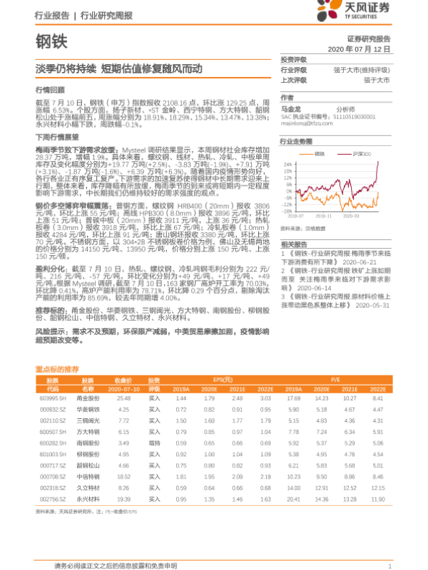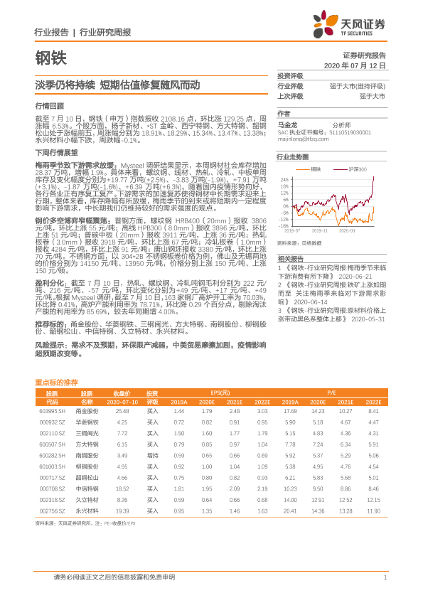 【天风证券】【20200712】20200712-天风证券-钢铁行业研究周报:淡季仍将持续 短期估值修复随风而动-13页