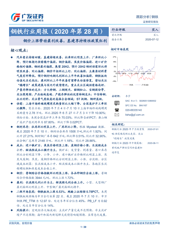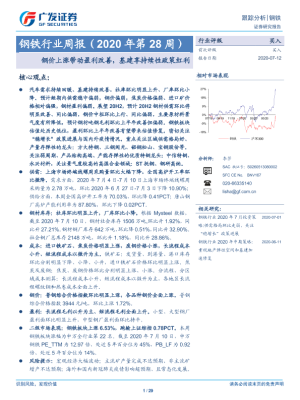 【广发证券】【20200712】20200712-广发证券-钢铁行业周报(2020年第28周):钢价上涨带动盈利改善,基建享持续性政策红利-29页