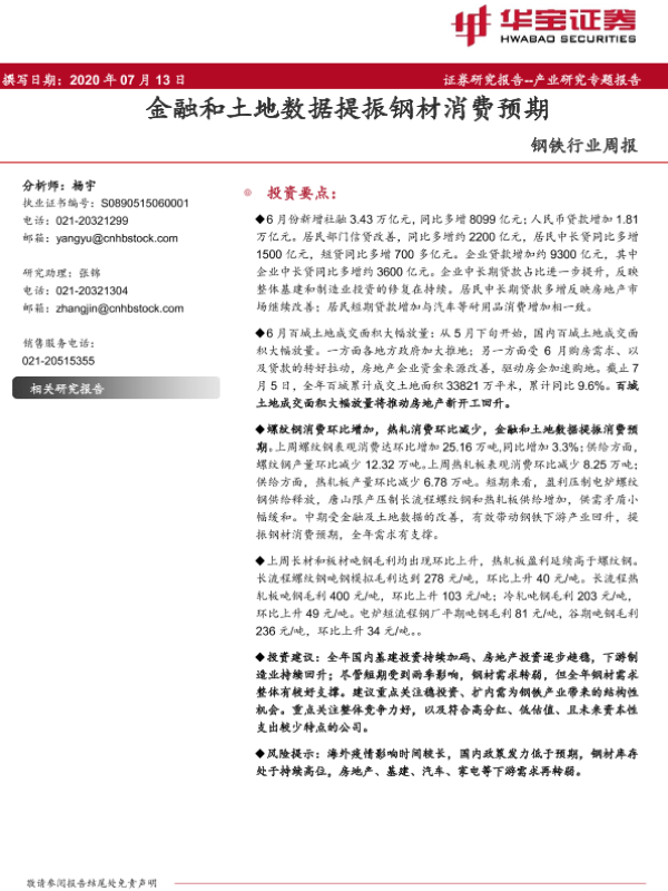 【华宝证券】【20200713】20200713-华宝证券-钢铁行业周报:金融和土地数据提振钢材消费预期-10页