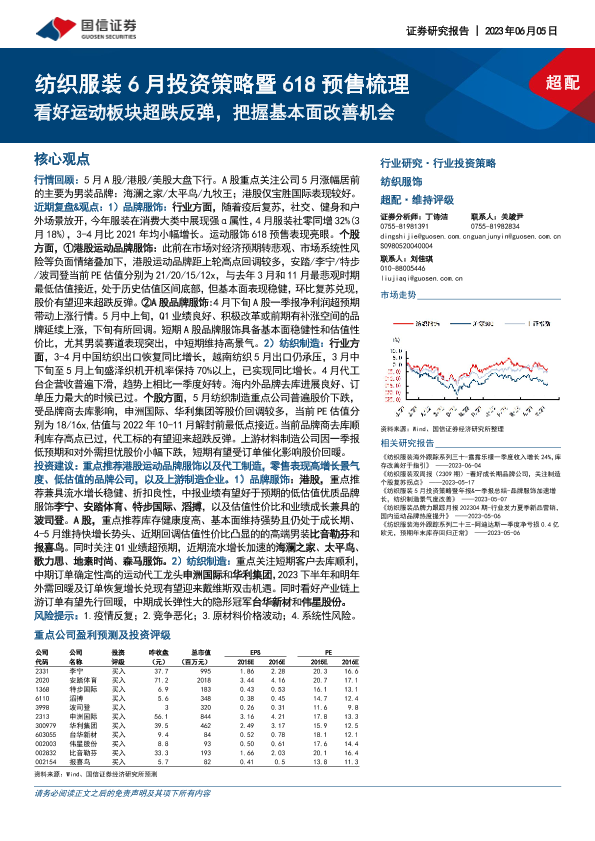 【国信证券】【20230605】20230605-国信证券-纺织服装6月投资策略暨618预售梳理:看好运动板块超跌反弹,把握基本面改善机会-24页
