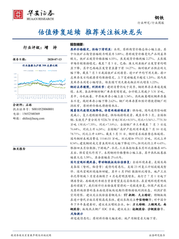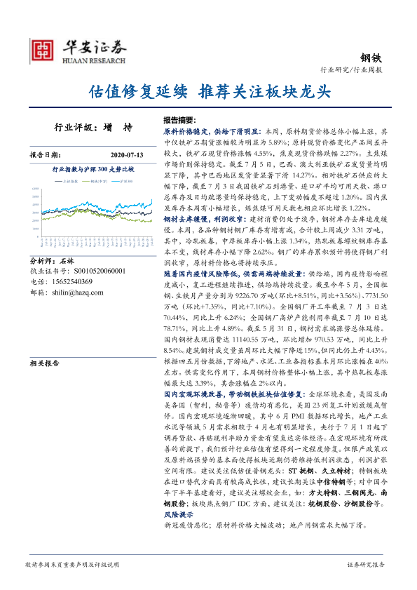 【华安证券】【20200713】20200713-华安证券-钢铁行业周报:估值修复延续 推荐关注板块龙头-26页