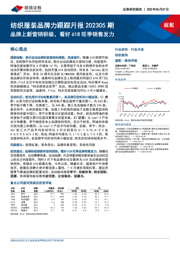 【国信证券】【20230607】纺织服装品牌力跟踪月报202305期:品牌上新营销积极,看好618旺季销售发力-18页