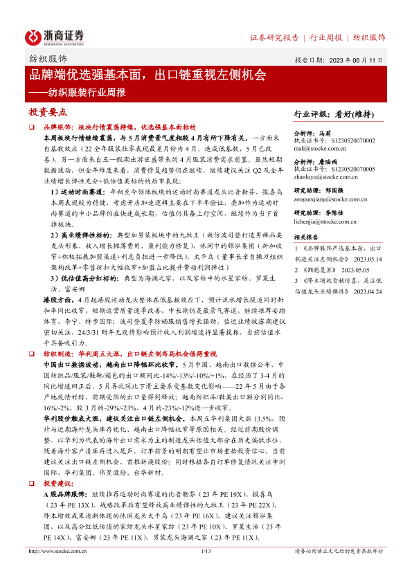 【浙商证券】【20230611】20230611-浙商证券-纺织服装行业周报:品牌端优选强基本面,出口链重视左侧机会-13页