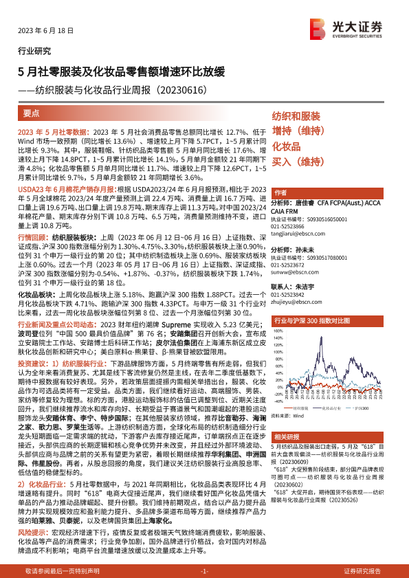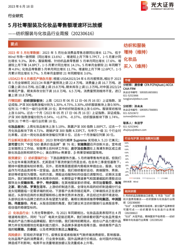 【光大证券】【20230618】20230618-光大证券-纺织服装与化妆品行业周报:5月社零服装及化妆品零售额增速环比放缓-11页