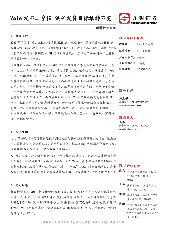 【川财证券】【20200721】材料行业日报:Vale发布二季报 铁矿发货目标维持不变-3页