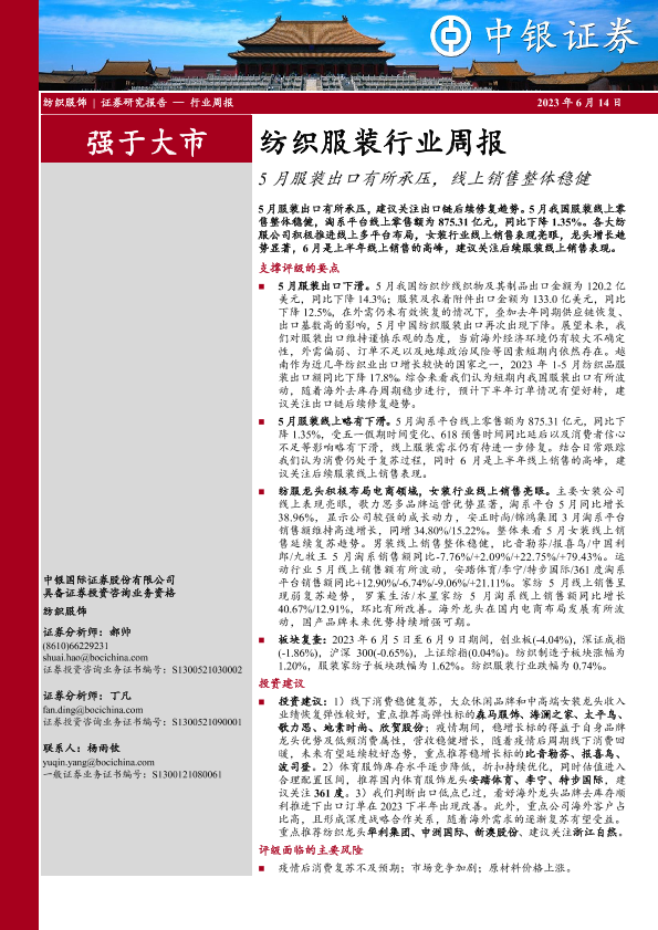 【中银证券】【20230614】20230614-中银证券-纺织服装行业周报:5月服装出口有所承压,线上销售整体稳健-23页