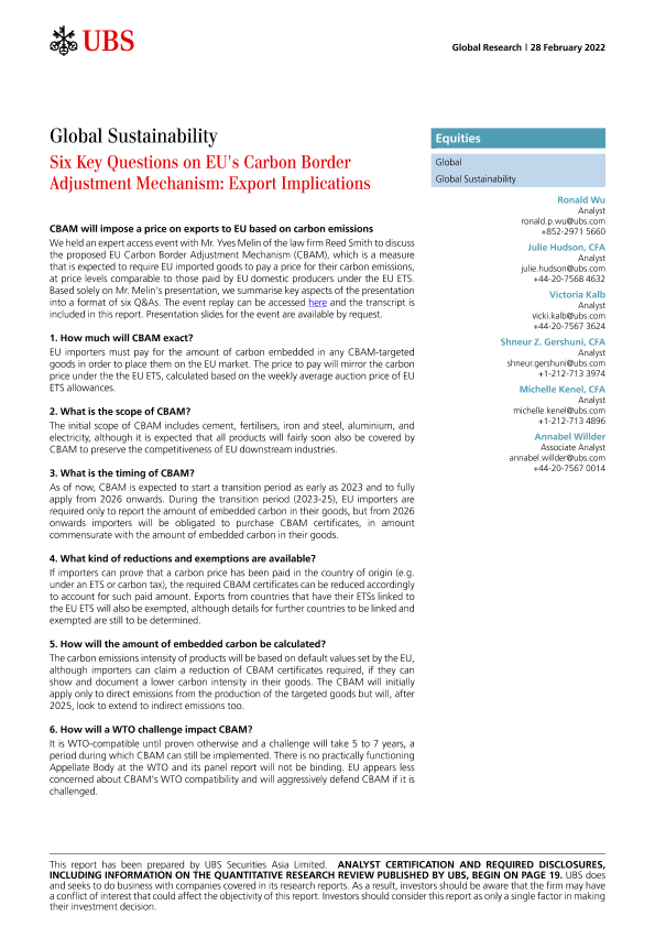 【瑞银】【20220228】瑞银-全球投资策略-欧盟碳边界调整机制的六个关键问题:出口影响-23页
