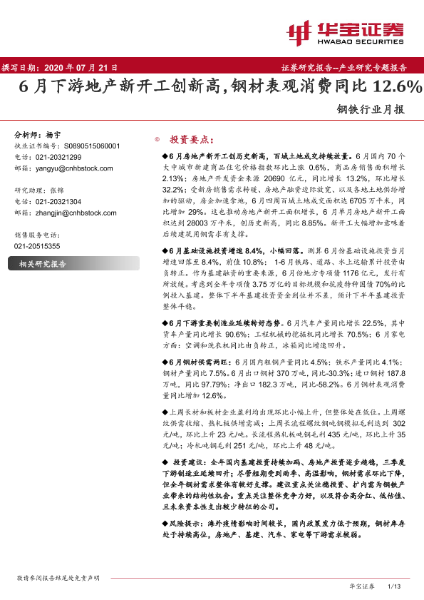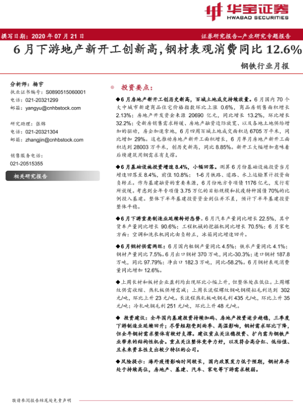 【华宝证券】【20200721】20200721-华宝证券-钢铁行业月报:6月下游地产新开工创新高,钢材表观消费同比12.6%-13页