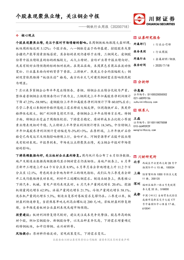 【川财证券】【20200718】20200718-川财证券-钢铁行业周报:个股表现聚焦业绩,关注钢企中报-17页