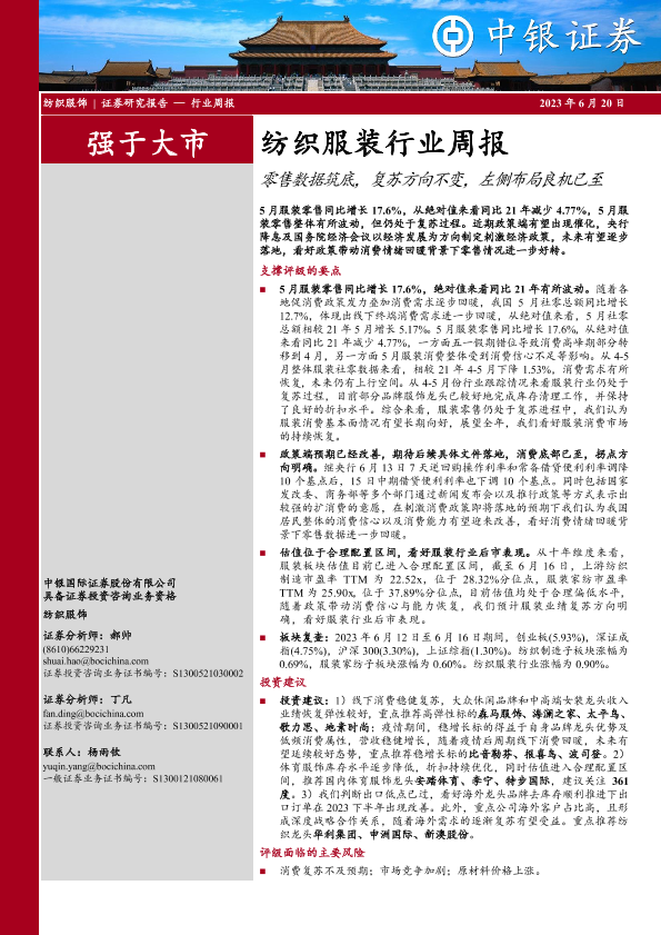 【中银证券】【20230620】20230620-中银证券-纺织服装行业周报:零售数据筑底,复苏方向不变,左侧布局良机已至-20页