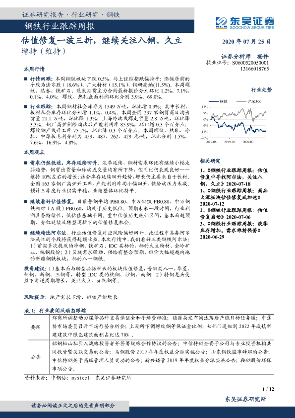 【东吴证券】【20200725】20200725-东吴证券-钢铁行业跟踪周报:估值修复一波三折,继续关注八钢、久立-12页