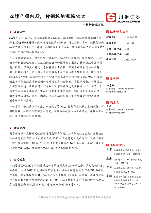【川财证券】【20200729】材料行业日报:业绩平稳向好,特钢板块涨幅较大-3页