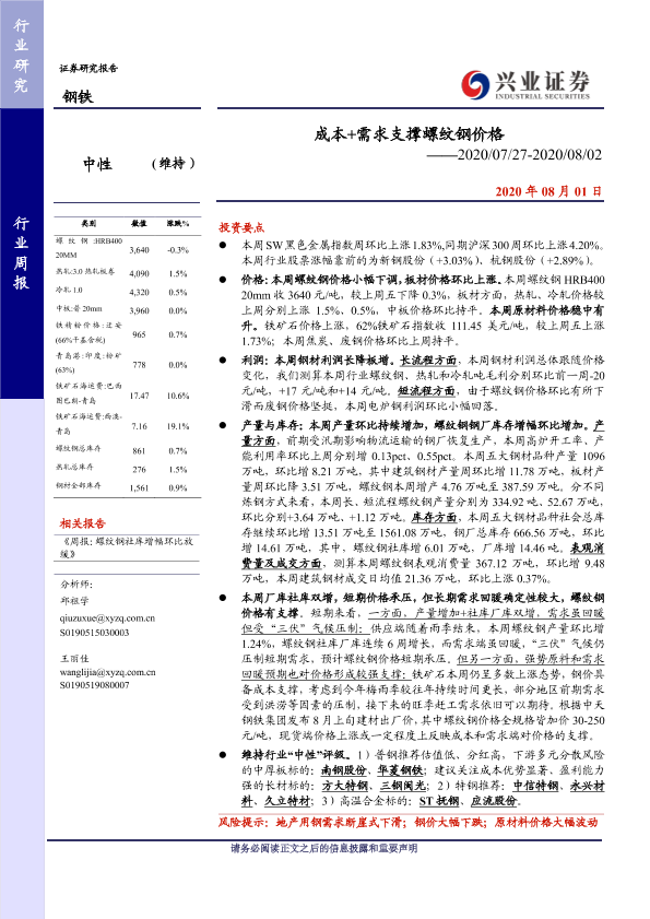 【兴业证券】【20200801】成本+需求支撑螺纹钢价格-17页