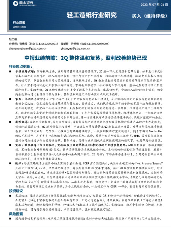 【国金证券】【20230701】20230701-国金证券-轻工造纸行业研究:2Q整体温和复苏,盈利改善趋势已现-19页